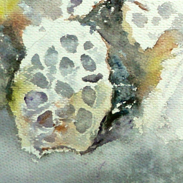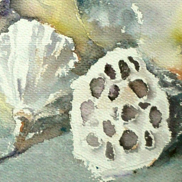 在艺术家侯岳的作品中,静物的呈现方式似乎遵循着一种独特的视角,它们往往与主体分离,在一场灰白色调的环绕中,透露出生机。画面中的莲蓬已然不再是轻轻荷叶上,潺潺流水中的莲蓬,但是在艺术家的描绘下,却依然能看到水中莲蓬的勃勃生机和它们周围氤氲缭绕的荷塘湿气。